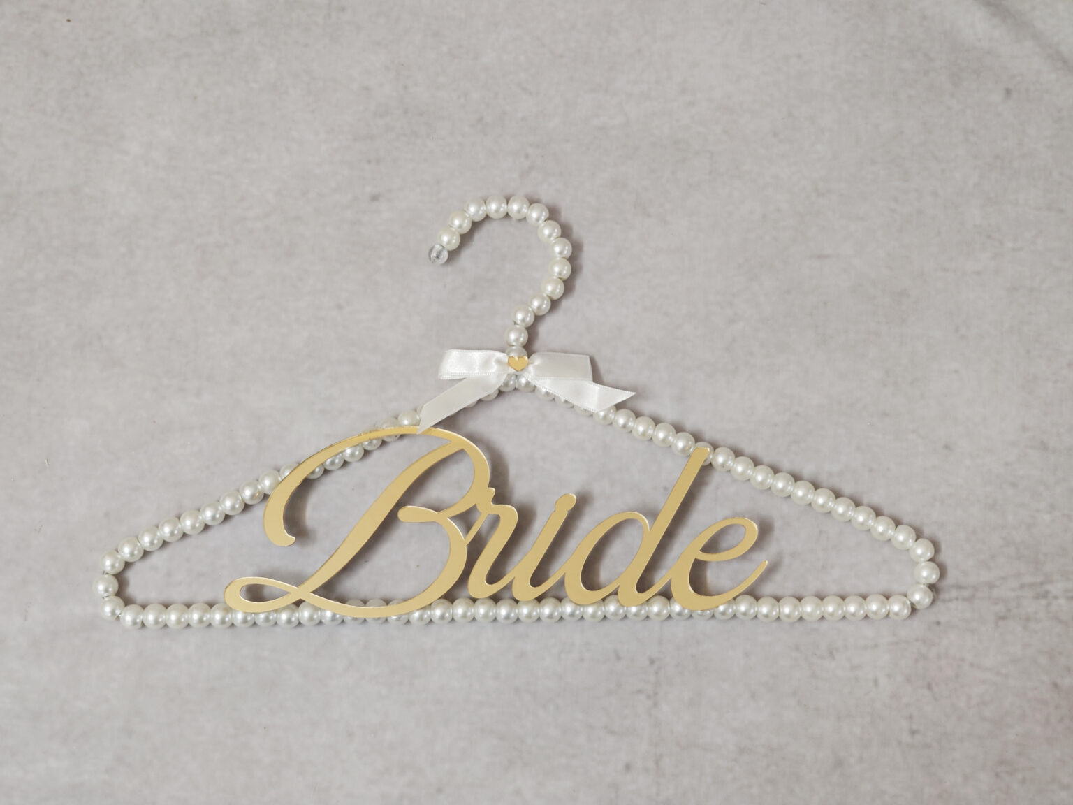 Κρεμάστρα για νυφικό, με πέρλες, χρυσό καθρέφτη plexiglass με το “Bride” και σατέν κορδέλα!