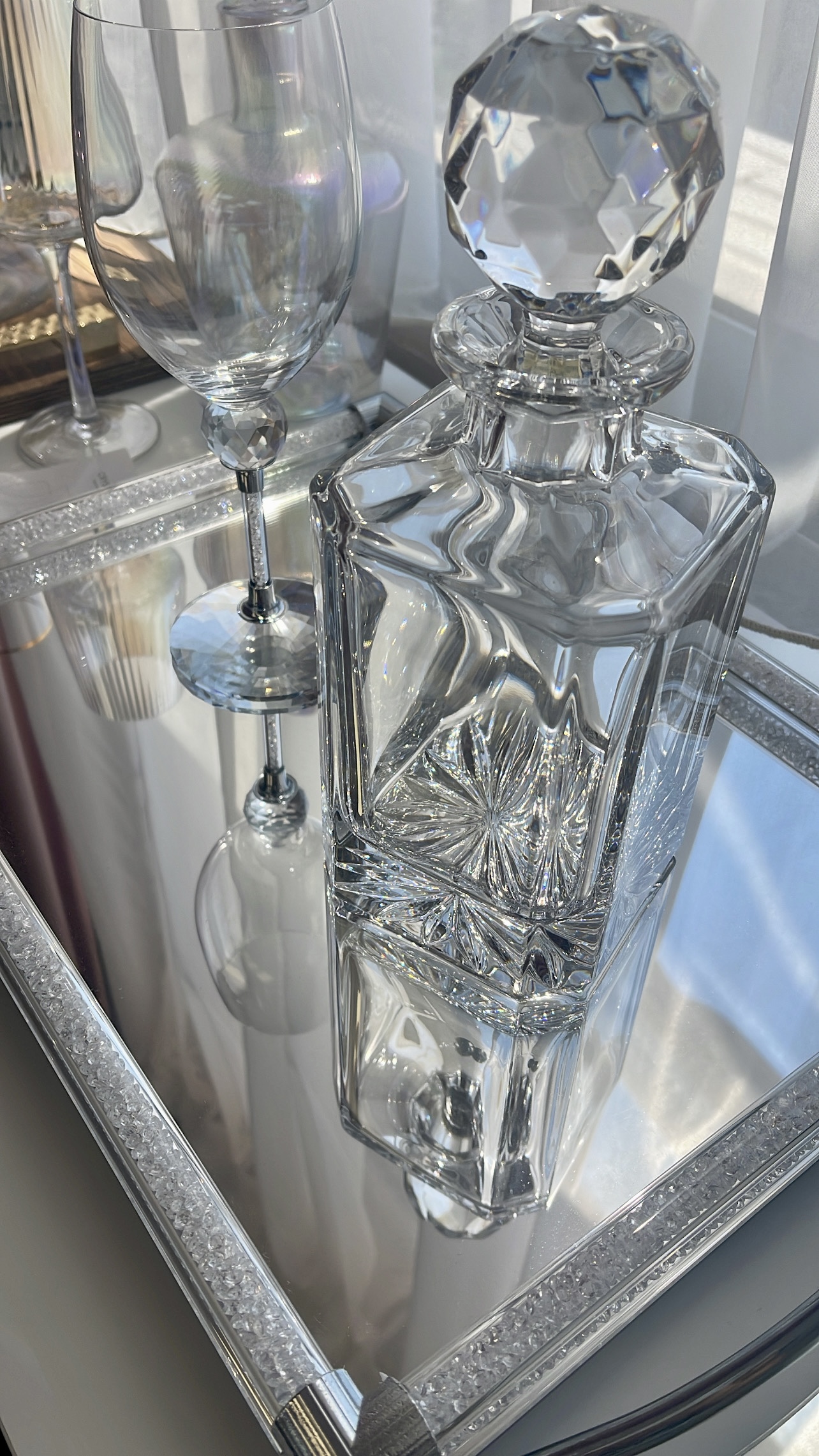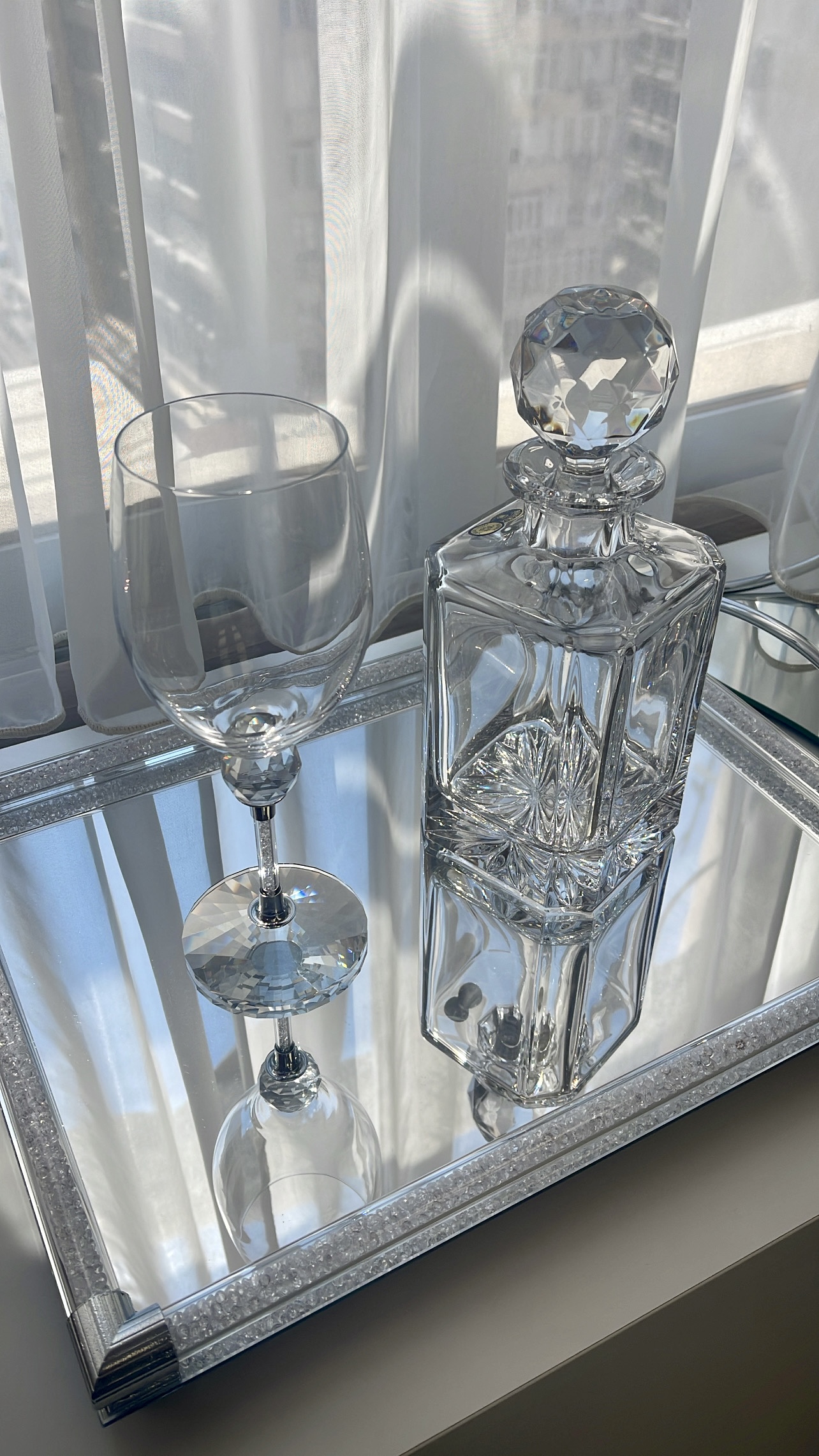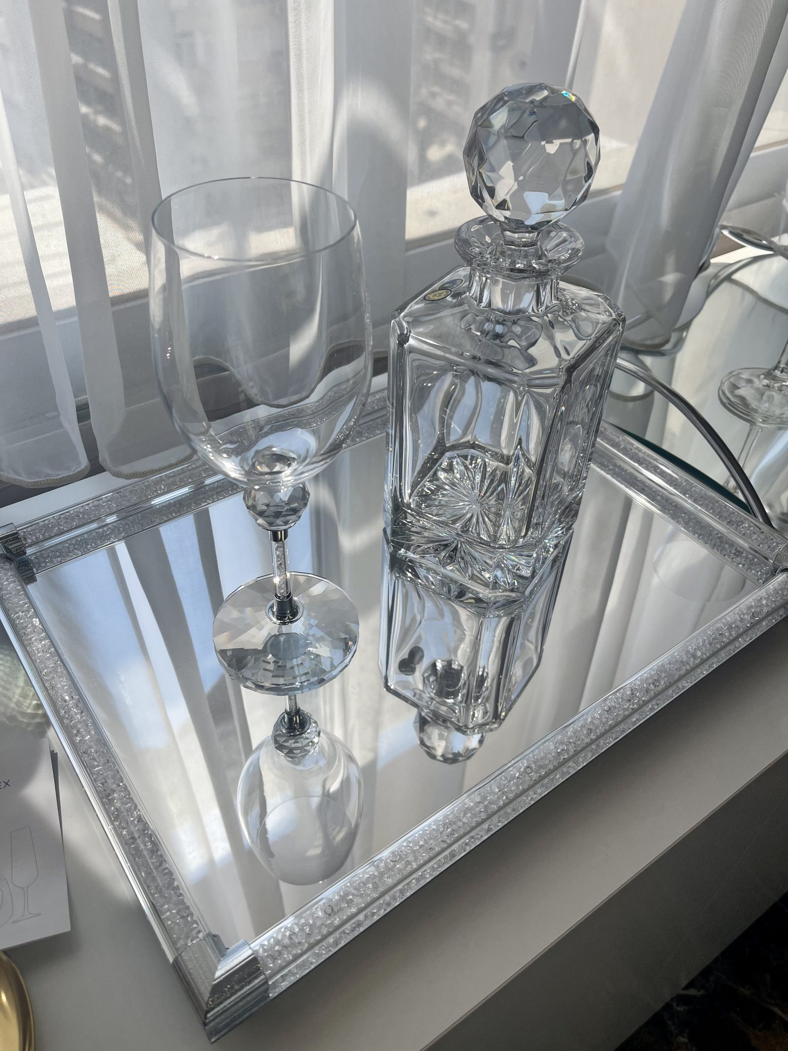 Πανέμορφο σετ κρασιού, με δίσκο γόνδολα με καθρέπτη. Κρυστάλλινο σετ καράφα/ποτήρι μοναδικής αισθητικής!